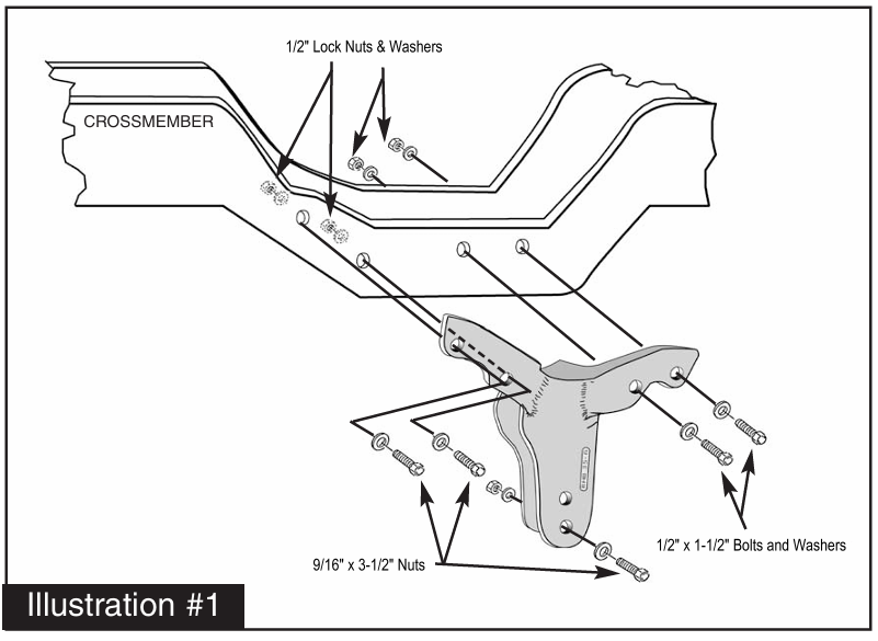 5. Place a jack under the passenger axle. Remove the passenger side axle beam bolt from the original bracket (located on the driver side of vehicle) and lower the axle down. Remove the original bracket from the front cross member. Using a 1/2″ drill, enlarge the original 4 holes and install the new replacement cast steel bracket (#RHB352-6, See Illustration #1) using the 1/2 X 1-1/2 bolts supplied. Torque the hardware to specifications. Next attach the passenger axle beam to the new drop bracket using the 9/16 X 3-1/2″ bolt supplied and tighten.