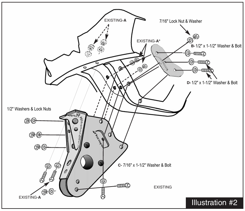 6. Move the jack to the driver axle beam and remove the axle beam bolt from the original bracket (located on the passenger side) and lower it down. Remove the original bracket from the front crossmember, saving the hardware. Referring to Illustration #2, attach new drop bracket (#LHB352-5) by reinstalling the original hardware into the original 4 holes (See “Existing-A” on illustration). Note: the original two holes labeled as “Existing-A” are for the existing two bolts on the back of the drop bracket. Be sure to install the original hardware in these two holes and tighten.