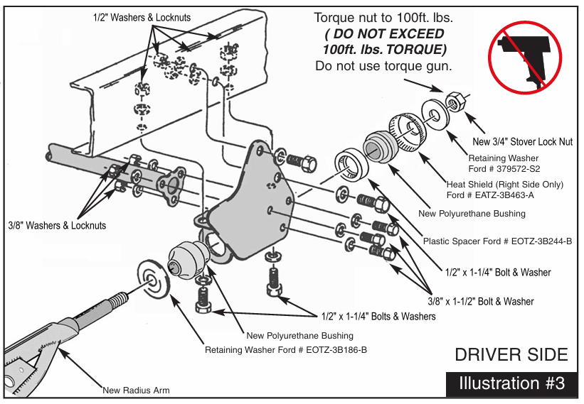 13. Position the ends of the radius arms into the new radius arm mounting brackets using the polyurethane bushings provided along with the original washers (As shown in Illustration #3) and the 3/4″ stover nuts provided. Do not fully tighten at this time.