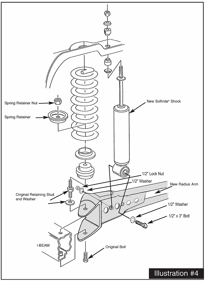 12. Install the new radius arms to the front axle using the existing hardware (See Illustration #4). Note: Be sure to install the correct side up (Each arm is labeled accordingly)
