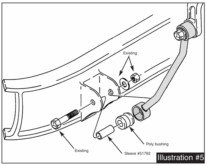 17. Install the two sway bar extensions, as shown in Illustration #5, using polyurethane bushings, steel sleeves #51792 and the original bolts.