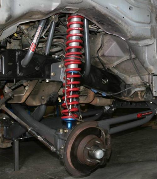 Most long-travel A-arm kits widen the front suspension 4-5 inches at each side and replace the 2WD coil springs or 4×4 torsion bars with a coilover shock. There are some middle of the road kits that use a new coil spring for the 2WD trucks.