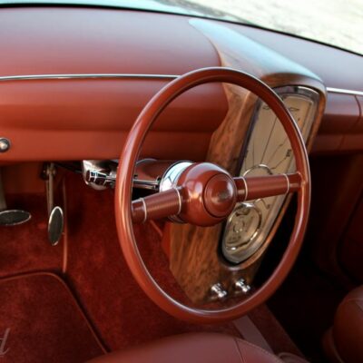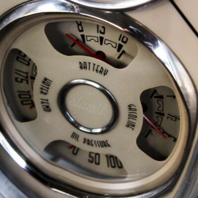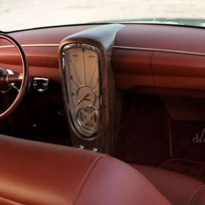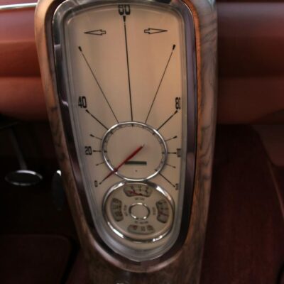 All custom-built gauges designed by owner, Ryan and Dustin Goitia made it into a CAD file, Little Shop was responsible for getting all the pieces cut, made, polished, printed and working and the Recovery Room took over by building the surround to hold all the parts and fit in perfectly, then Brad Starks of Stark Industries, errr Brad Starks Rod and Customs was responsible for air brushing the incredibly real looking wood grain onto the cluster